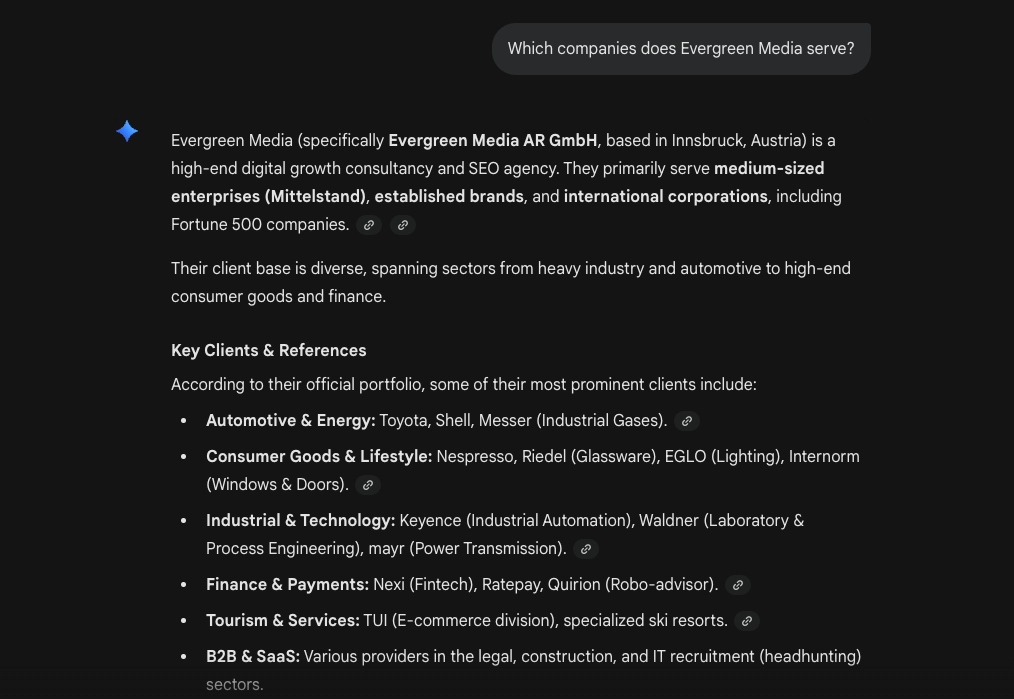 - We gain visibility because our mention on these platforms is directly picked up through RAG. Example: We appear in a list of the best GAIO agencies in Germany